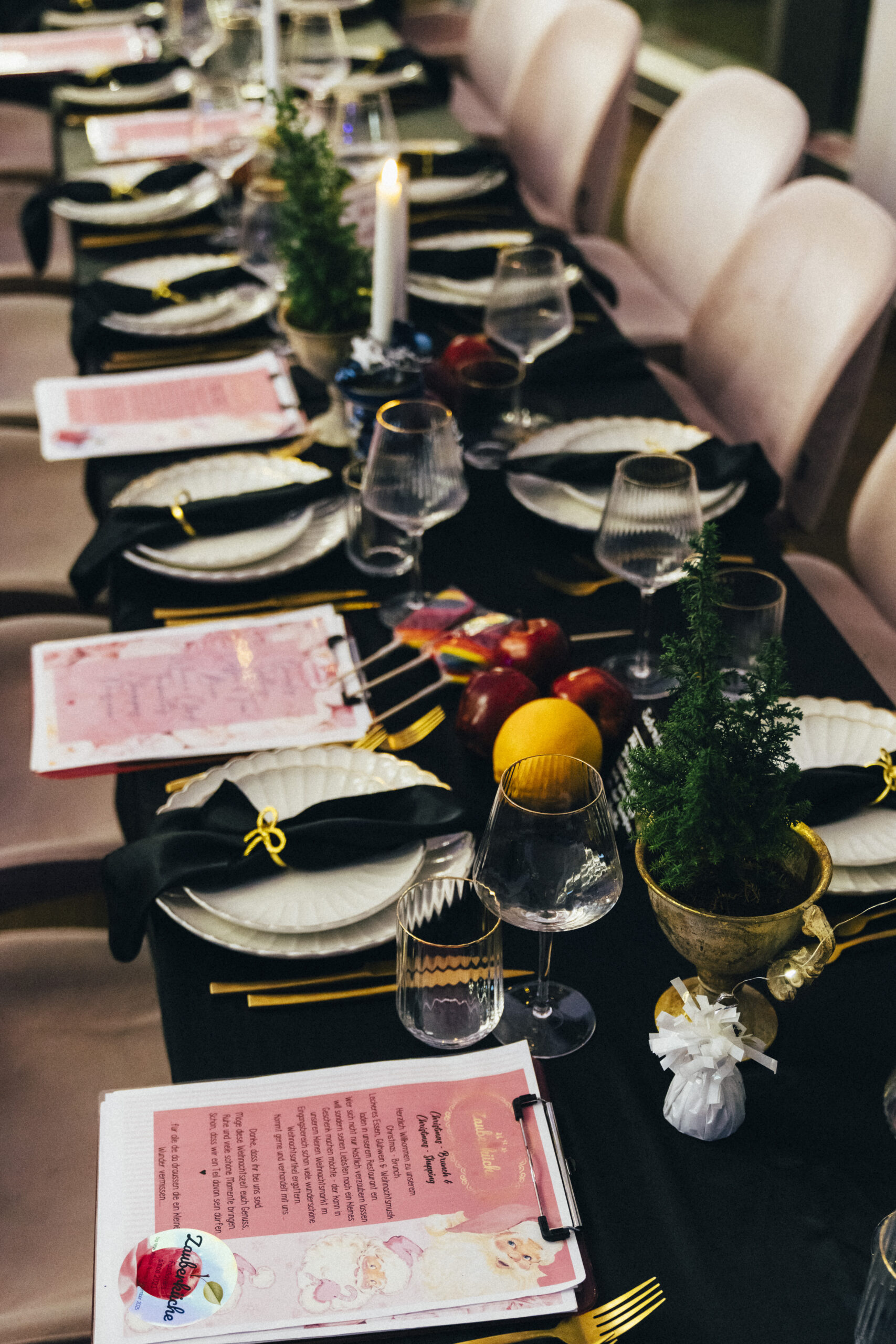 Zum Auftakt begrüßen wir dich mit einem magischen Aperitif, bevor du an den stilvoll gedeckten Tafeln Platz nimmst – gedeckt wie im Zauberschloss selbst.