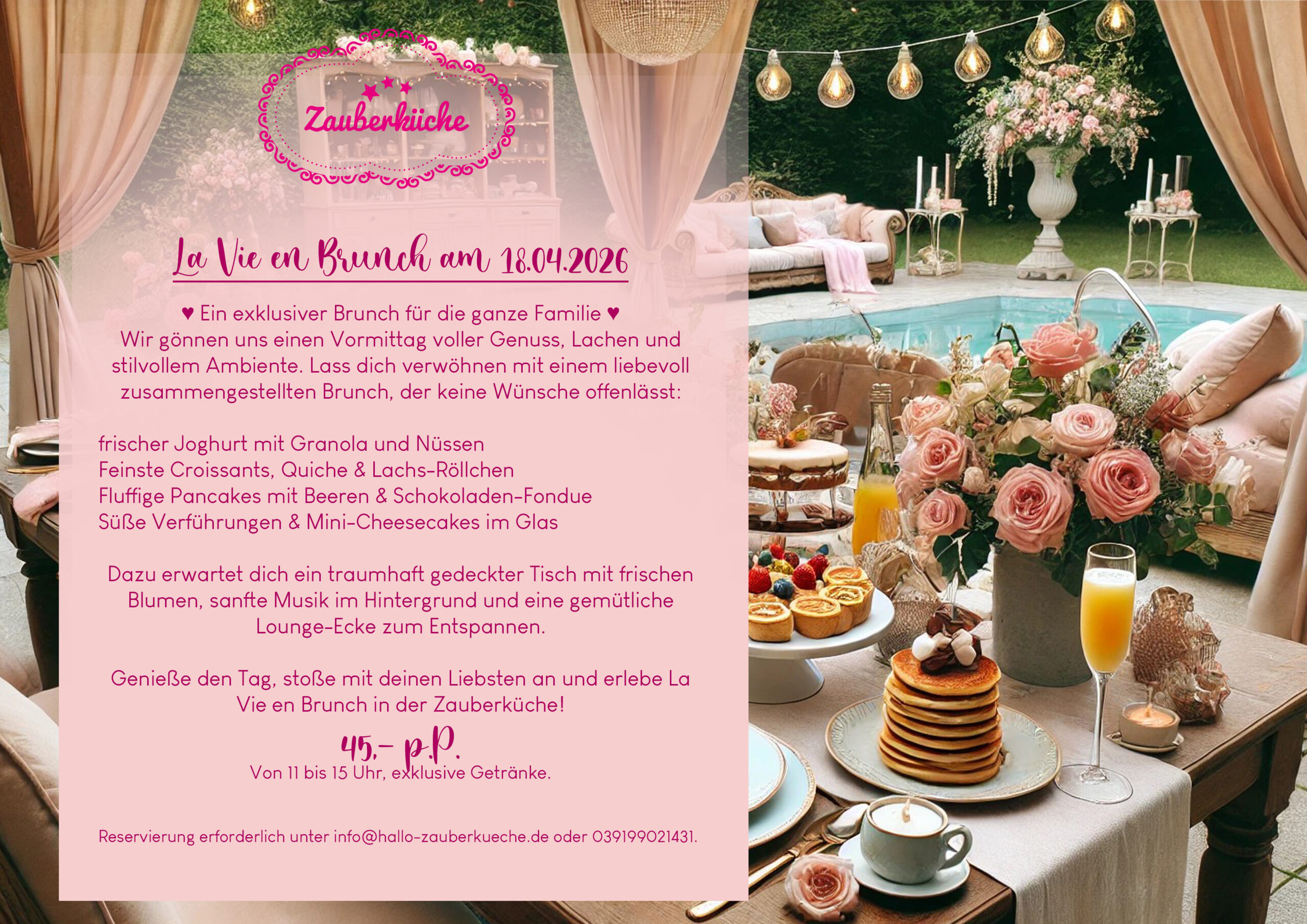 Wir gönnen uns einen Vormittag voller Genuss, Lachen und stilvollem Ambiente. Lass dich verwöhnen mit einem liebevoll zusammengestellten französischen Brunch, der keine Wünsche offenlässt: frischer Joghurt mit Granola und Nüssen Feinste Croissants, Quiche & Lachs-Röllchen Fluffige Pancakes mit Beeren & Schokoladen-Fondue Süße Verführungen & Mini-Cheesecakes im Glas Dazu erwartet dich ein traumhaft gedeckter Tisch mit frischen Blumen, sanfte Musik im Hintergrund und eine gemütliche Lounge-Ecke zum Entspannen. Genieße den Tag, stoße mit deinen Liebsten an und erlebe La Vie en Brunch in der Zauberküche! Von 11 bis 15 Uhr.